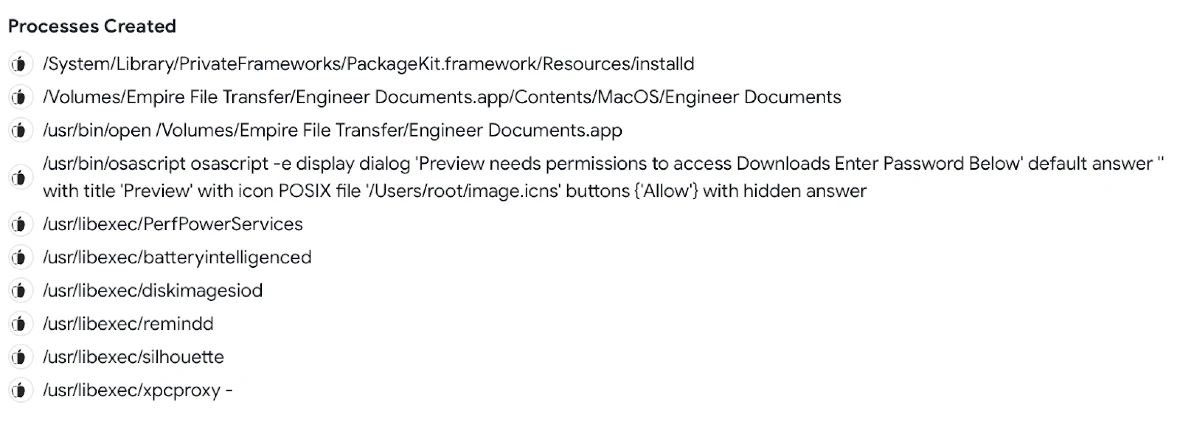 Moonlock Lab’s further investigations revealed that the Empire Transfer 12.3.23.dmg deploys various techniques to execute its malicious actions, including launching AppleScript via the “osascript” tool to deceive users into revealing their passwords.